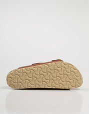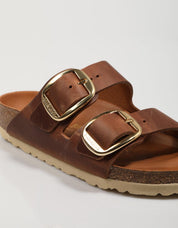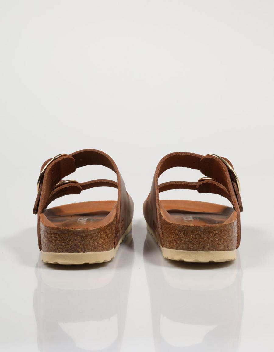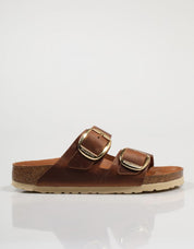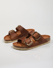 La firma alemana Birkenstock es famosa especialmente por este modelo de sandalia ergonómica adaptándose al pie. Utiliza materias primas de calidad, seleccionando todos los detalles al máximo, como esta sandalia en color marrón combinada con dos hebillas doradas en su pala. Suave y cómoda, ideal para cualquier look. ¡No te lo vas a quitar en todo el verano!