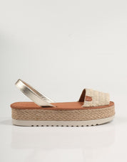 Descubre las Sandalias de Plataforma POPA Saona Flecos en lona beige, el equilibrio perfecto entre estilo y confort para tus días de verano. Su diseño distintivo con flecos y plataforma de esparto las convierte en un imprescindible.