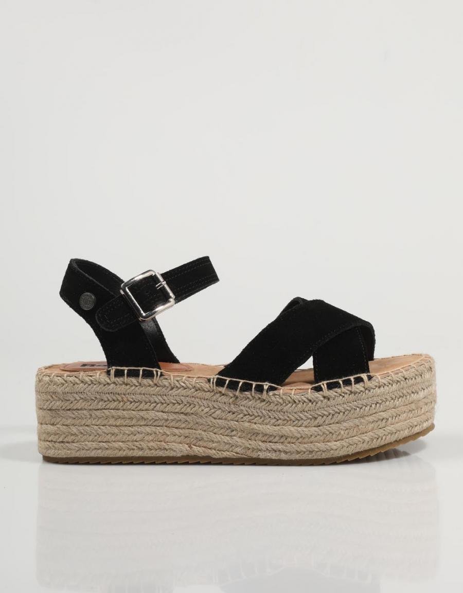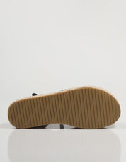 sandalia en color negro cuenta con un diseño de tiras cruzadas que le da un toque moderno y elegante. Además, el cierre mediante hebilla garantiza un ajuste perfecto y seguro para tus pies.