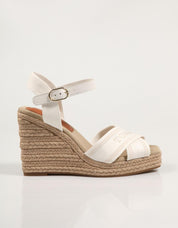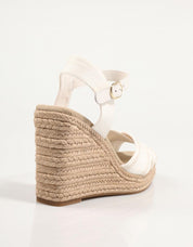 - Diseño de cuña alta: Suela de cuña cubierta de yute tejido que aporta altura y un estilo mediterráneo.