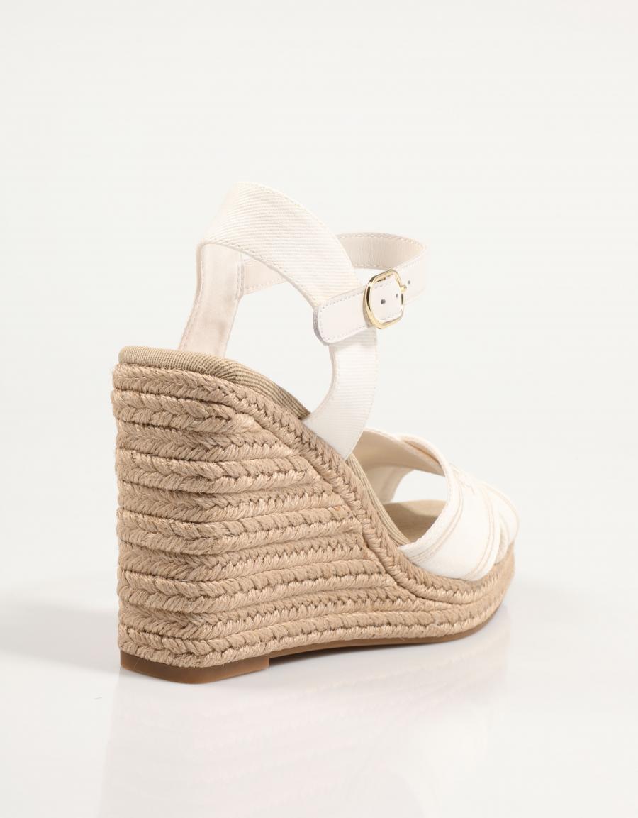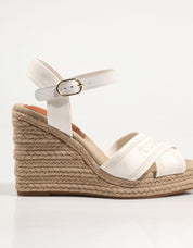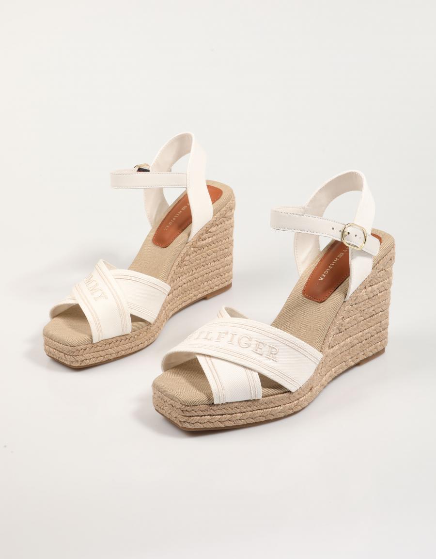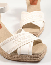 Eleva tu estilo veraniego con las sandalias de cuña Francesca Espad H de TOMMY HILFIGER. Confeccionadas en lona blanca, estas sandalias combinan la elegancia clásica con un toque casual, perfectas para cualquier ocasión, desde un paseo por la ciudad hasta una cena al aire libre.