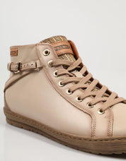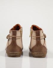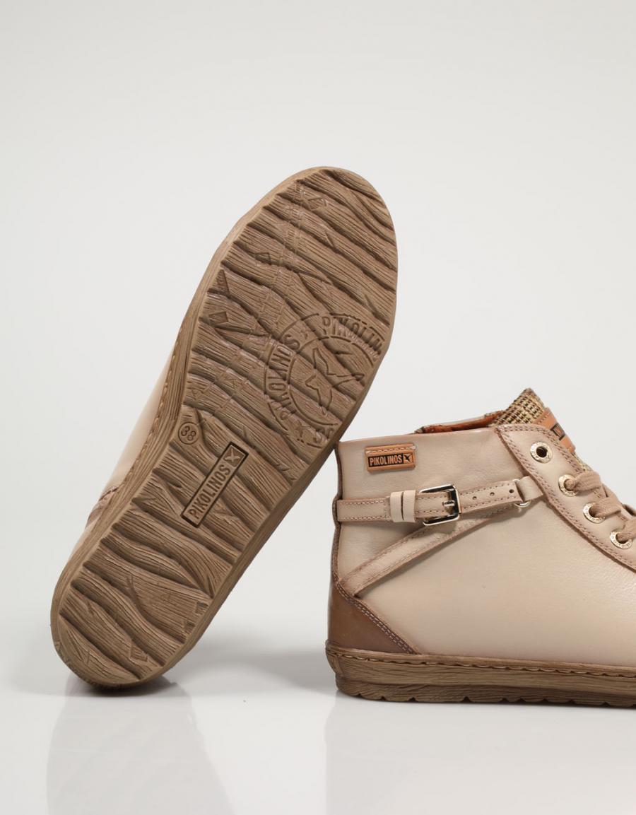 Nacidos en el año 1984, creada en una de las cunas del calzado a nivel mundial, el levante español. Todos los modelos respetan la tradición artesana. La marca Pikolinos busca la máxima calidad y comodidad en sus productos así como las últimas tendencias en la moda. Este botín en color hielo , tiene detalles dorados y pulsera con hebilla en su lateral, cierre mediante cremallera; además, de un ajuste gracias a sus cordones. Confeccionado en piel de primera calidad. La caña mide 10 cm aproximadamente ¡No lo pienses más!
