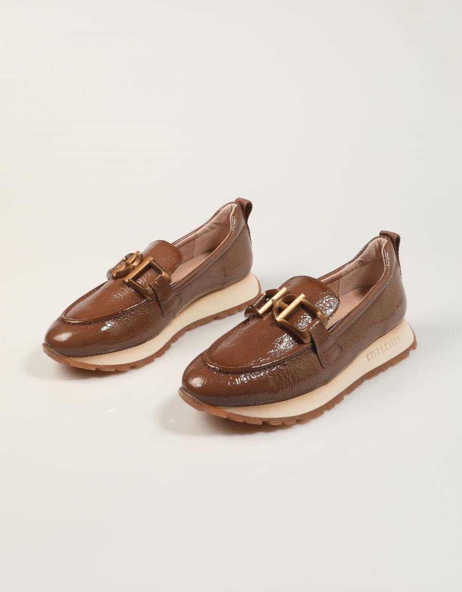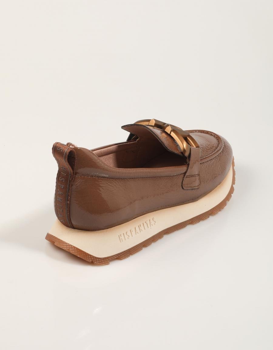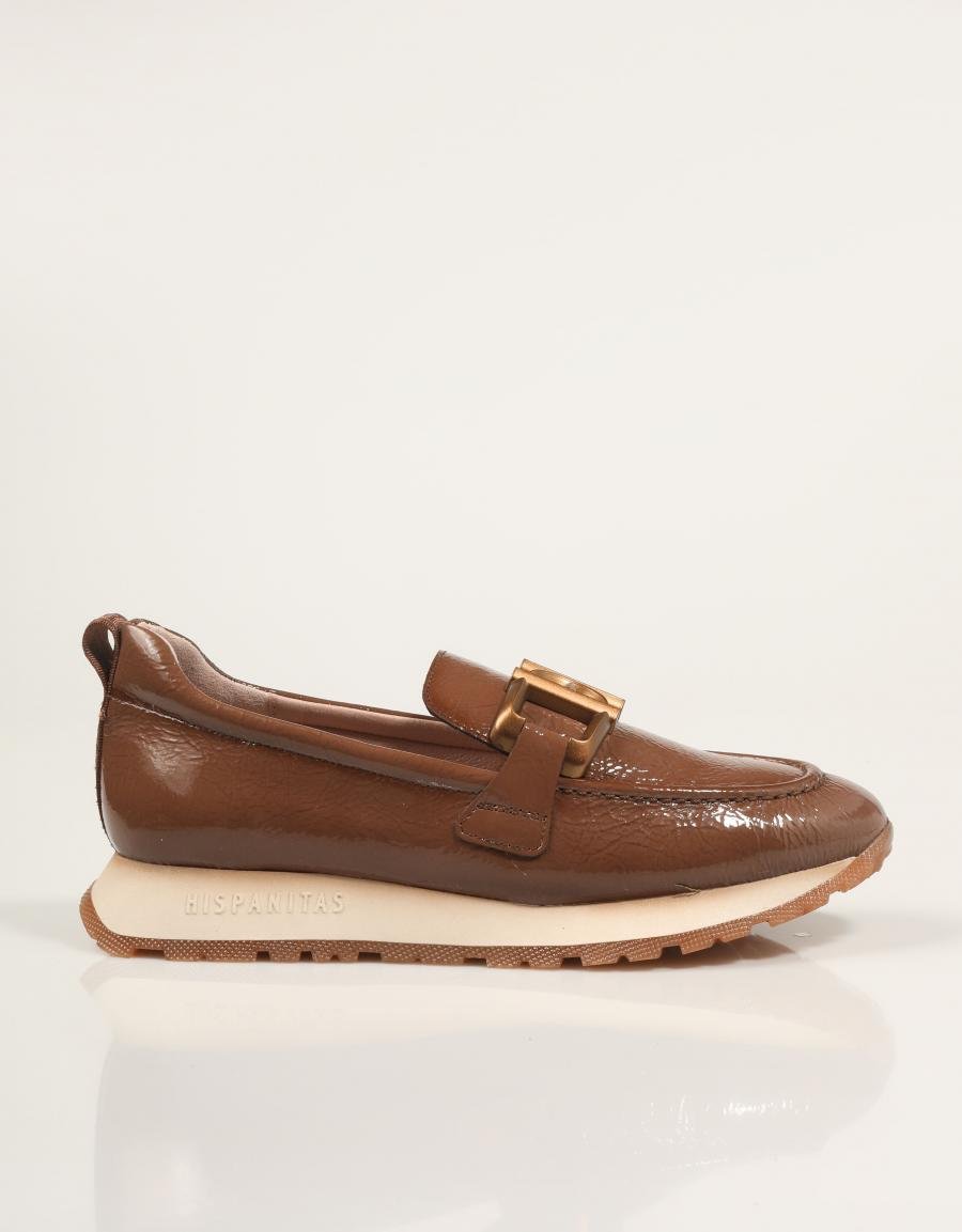 Discover the Hispanitas Kansas I25 loafers, an essential addition to your wardrobe. Crafted from shiny brown patent leather, these loafers combine elegance and comfort for everyday wear.