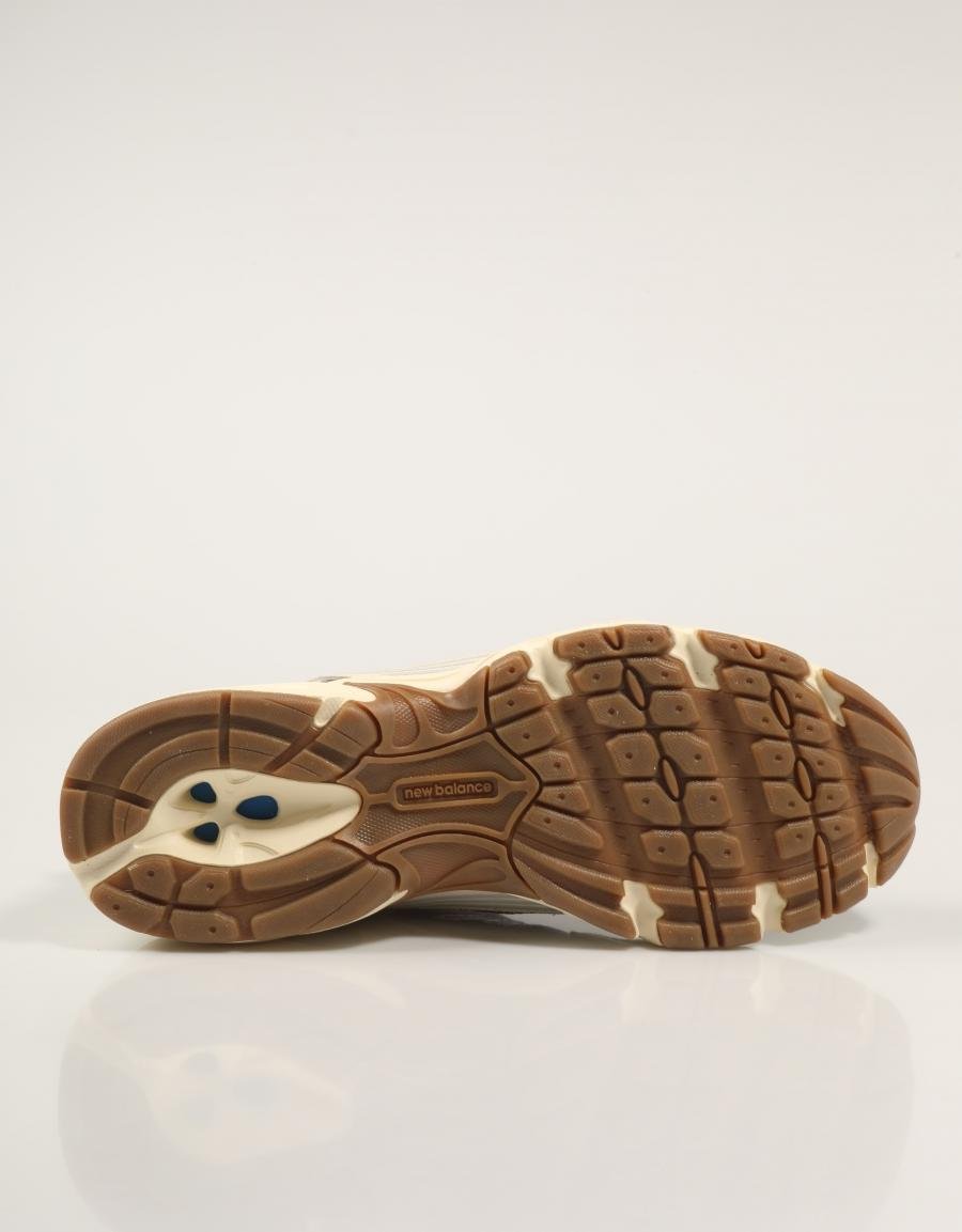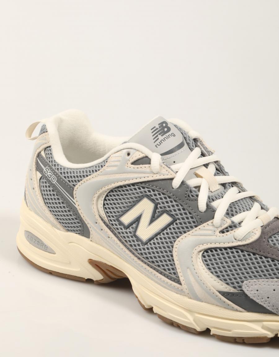 - Design et Matériaux: Fabriquées avec une tige en mesh respirant et en daim gris clair, rehaussées de détails couleur crème et du logo 'N' gris emblématique sur le côté.