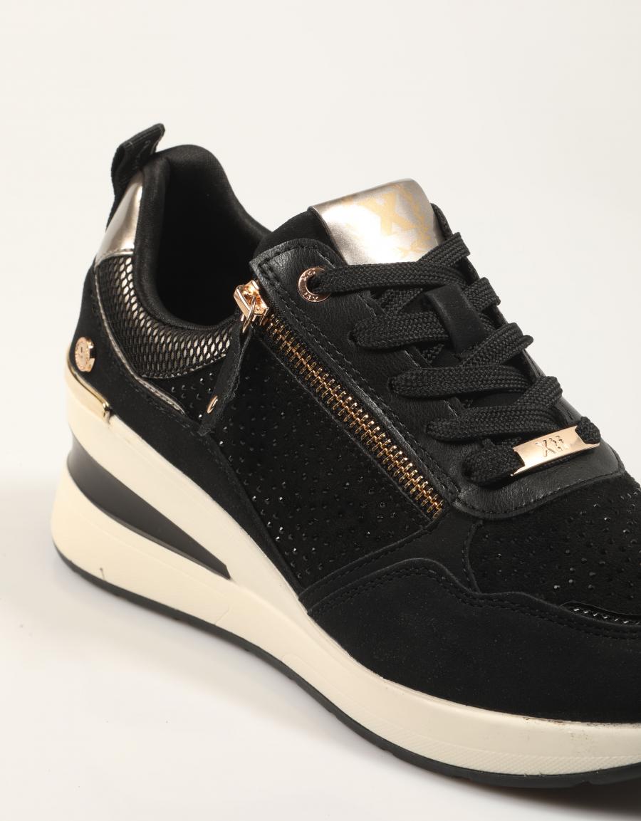 Découvrez les baskets XTI 144377, un modèle incontournable qui allie style et confort. Conçues en similicuir noir avec des empiècements en tissu perforé, ces baskets offrent un look moderne et polyvalent, idéal pour toutes les occasions.