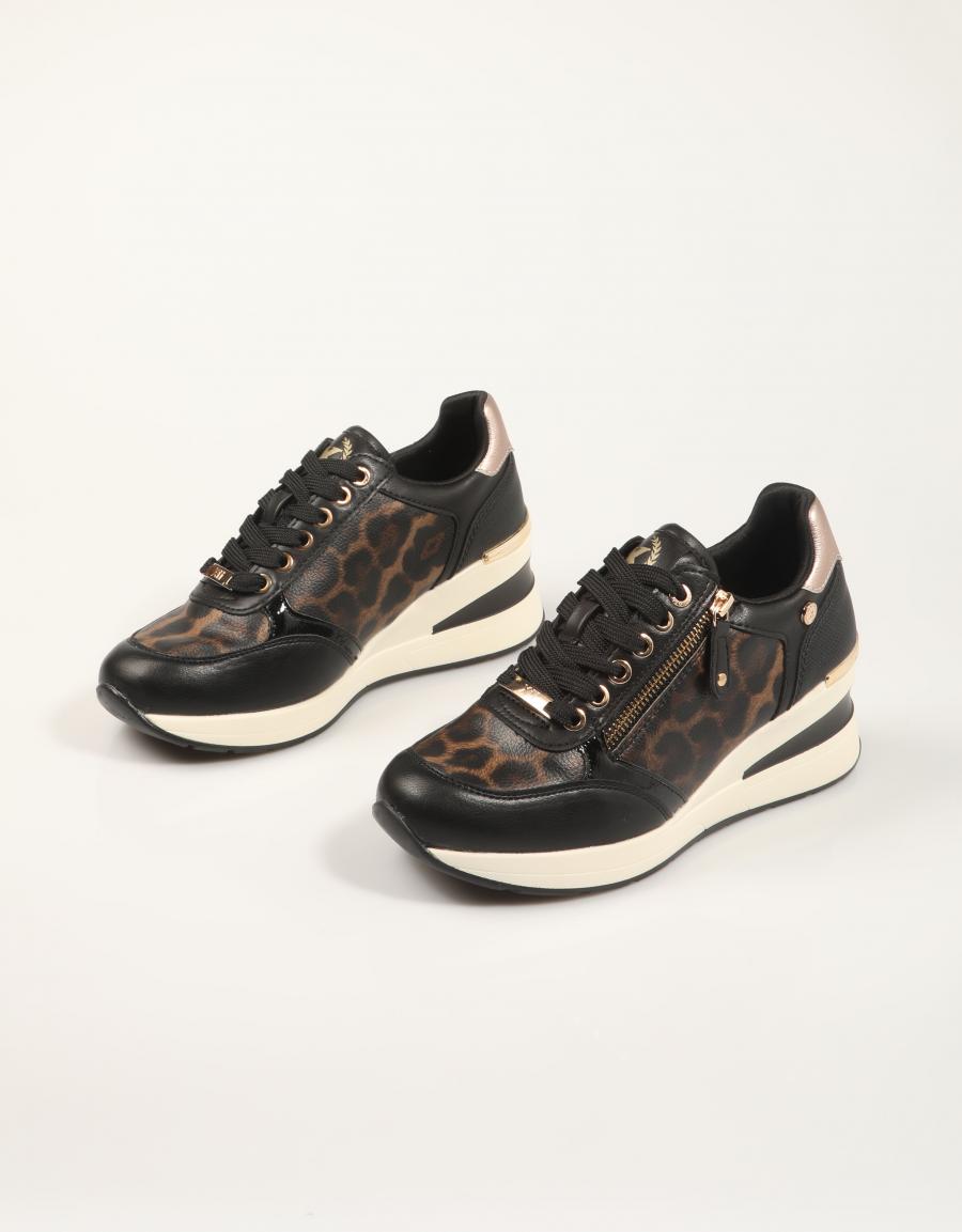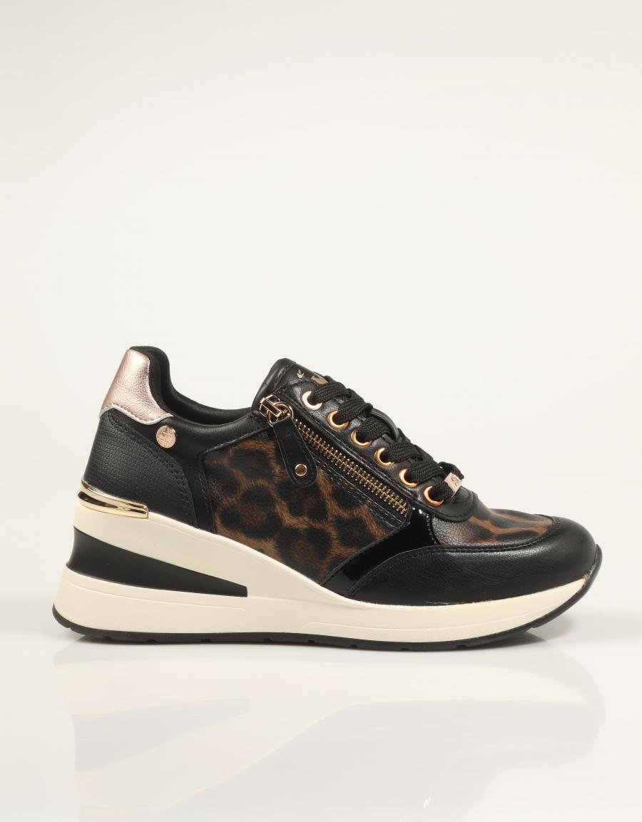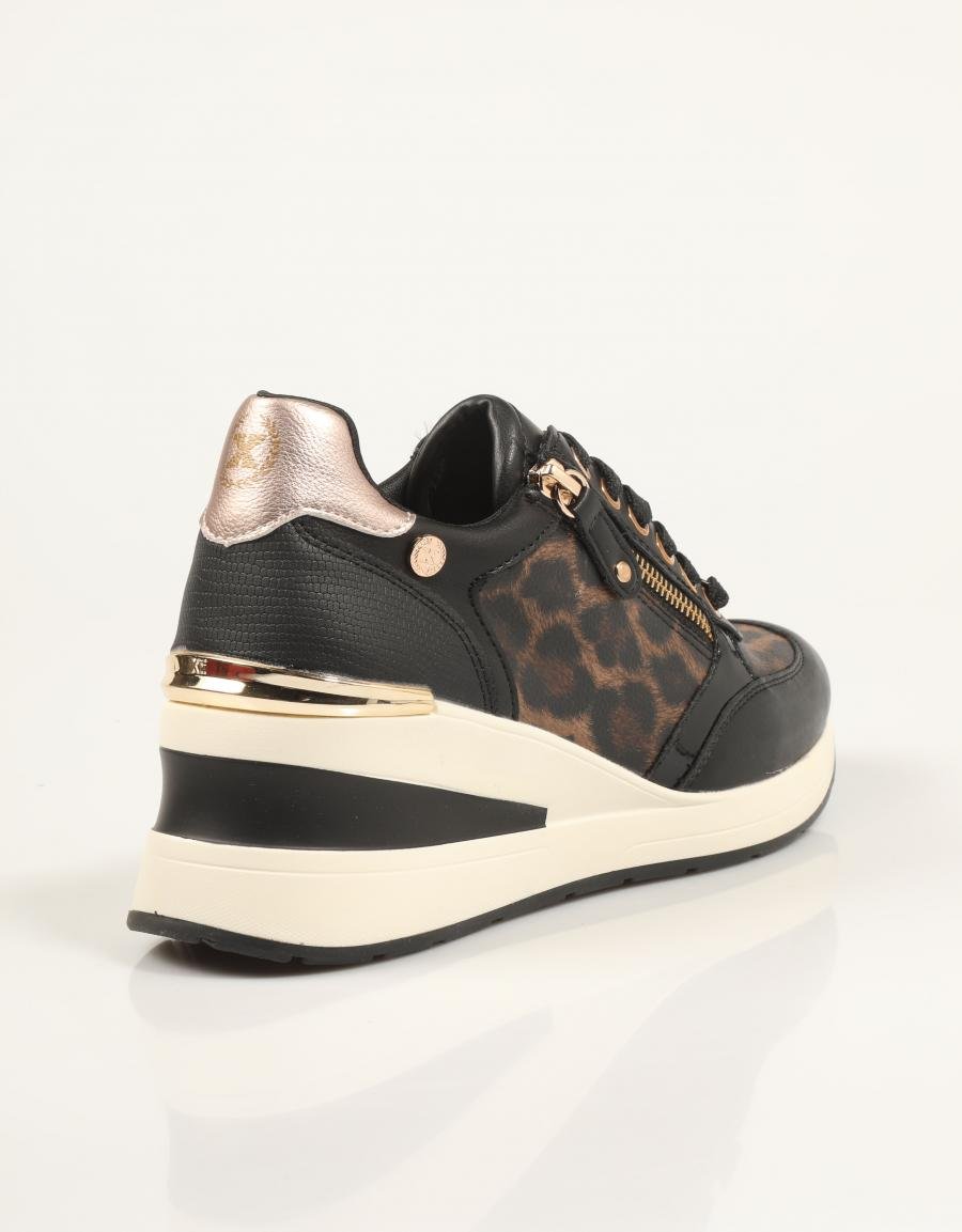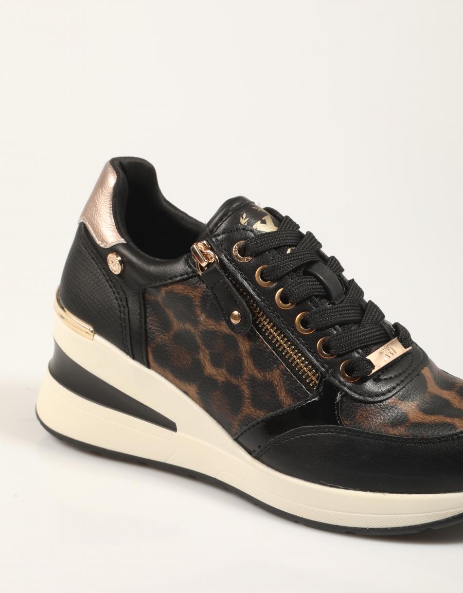 Découvrez les baskets compensées XTI 144378, une fusion parfaite de style et de confort. Conçues en similicuir noir, ces chaussures se distinguent par leur imprimé léopard audacieux et leurs détails dorés sophistiqués, idéales pour rehausser n'importe quel look décontracté.