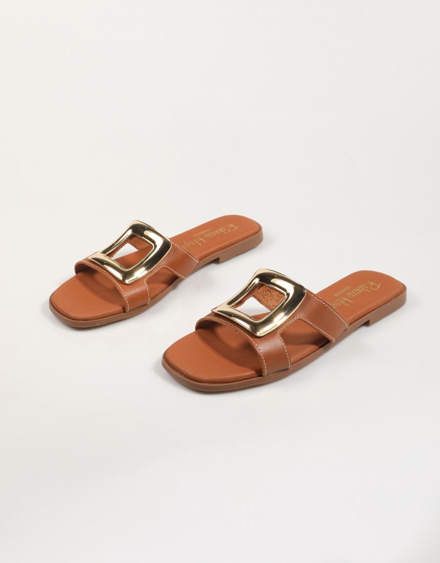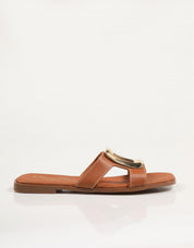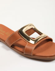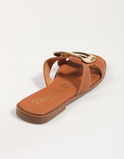 Scopri comfort e stile con i nostri sandali bassi in pelle REBECCA HOPE 5565. Realizzati in pelle color caramello, questi sandali presentano un design a fascia singola e larga sul collo del piede, impreziosito da una sorprendente fibbia metallica dorata di grandi dimensioni.