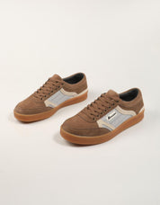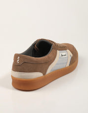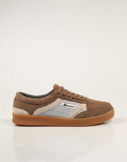Scopri le Sneaker Morrison Nineties, un modello a taglio basso che fonde lo stile retrò con la qualità contemporanea. Realizzate in morbido camoscio marrone e arricchite da dettagli in pelle beige, queste sneaker presentano un distintivo pannello centrale in tessuto grigio chiaro con un motivo a rombi. La suola in gomma marrone abbinata completa un design versatile e pieno di carattere.