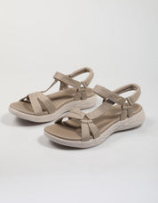 Si quieres darle una alegría a tus pies, llévate estas sandalias en color beig de Skechers. El sistema de la plantilla Arch Fit está patentada por la marca y diseñada por podólogos, adaptándose totalmente al pie.